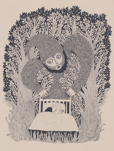 Her prints and drawings have a strong sense of narrative, and her stories are inspired by woodlands, folklore, sorcery and dreamscapes.